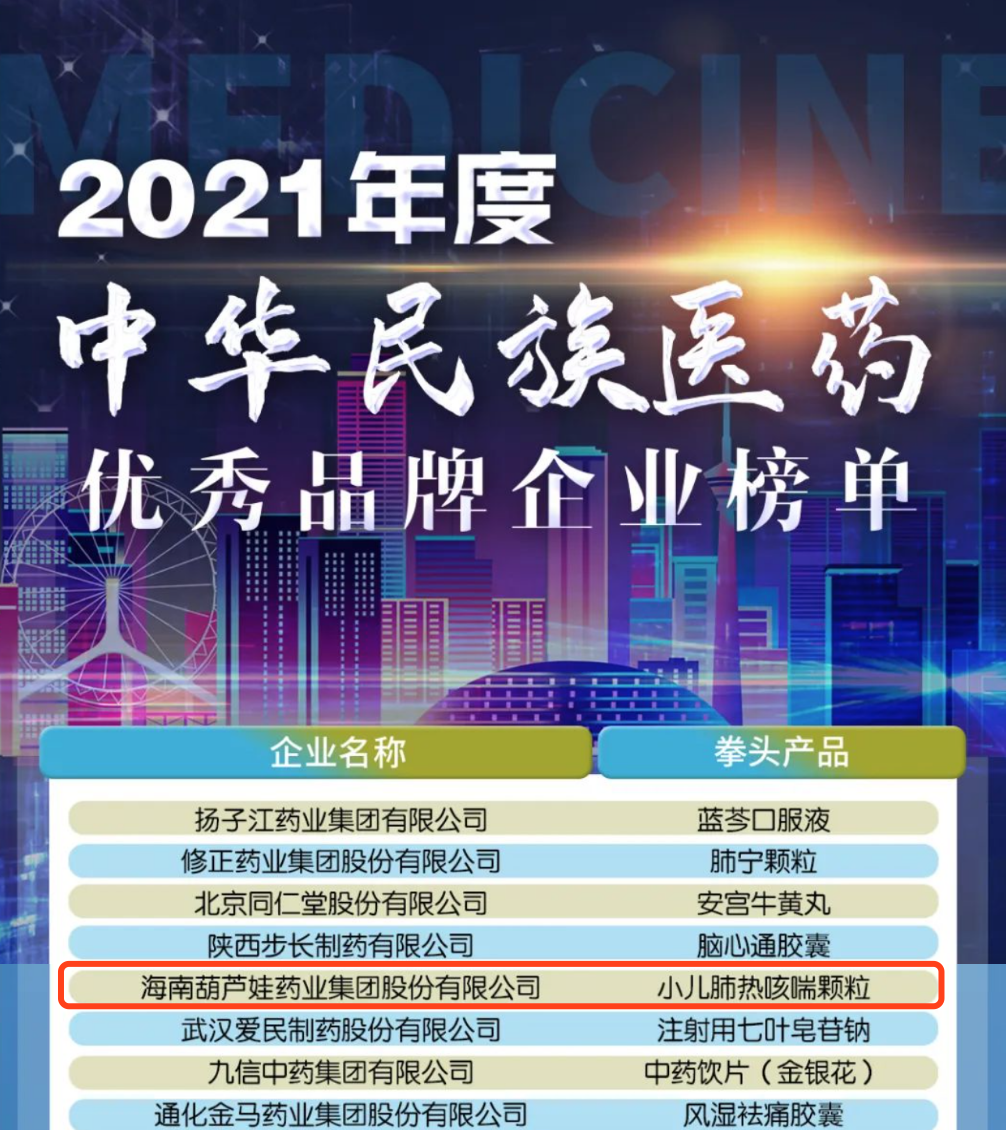 12月29日,全国工商联医药业商会发布了“2021年度中华民族医药优秀品牌企业榜单”,z6尊龙时凯药业集团凭借黄金单品小儿肺热咳喘颗粒(4克)实力登榜。